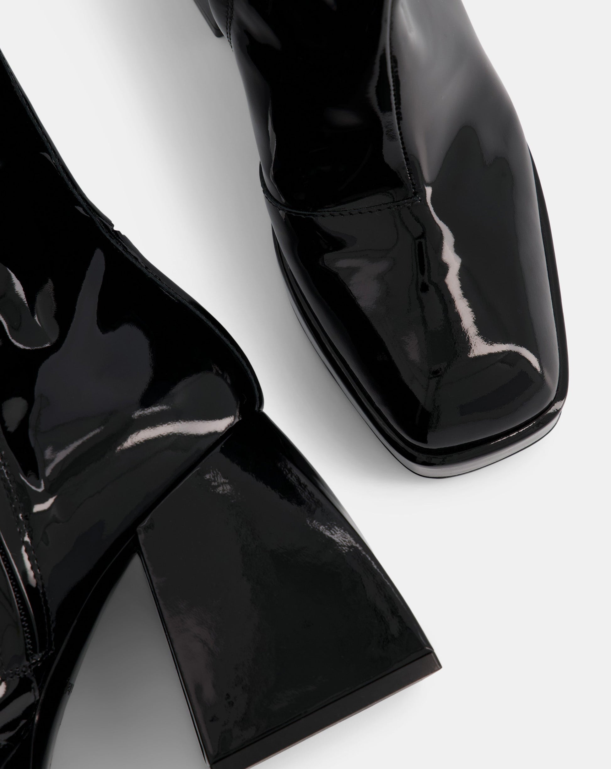 Platform ankle boot in patent cow leather with size-zip fastening.